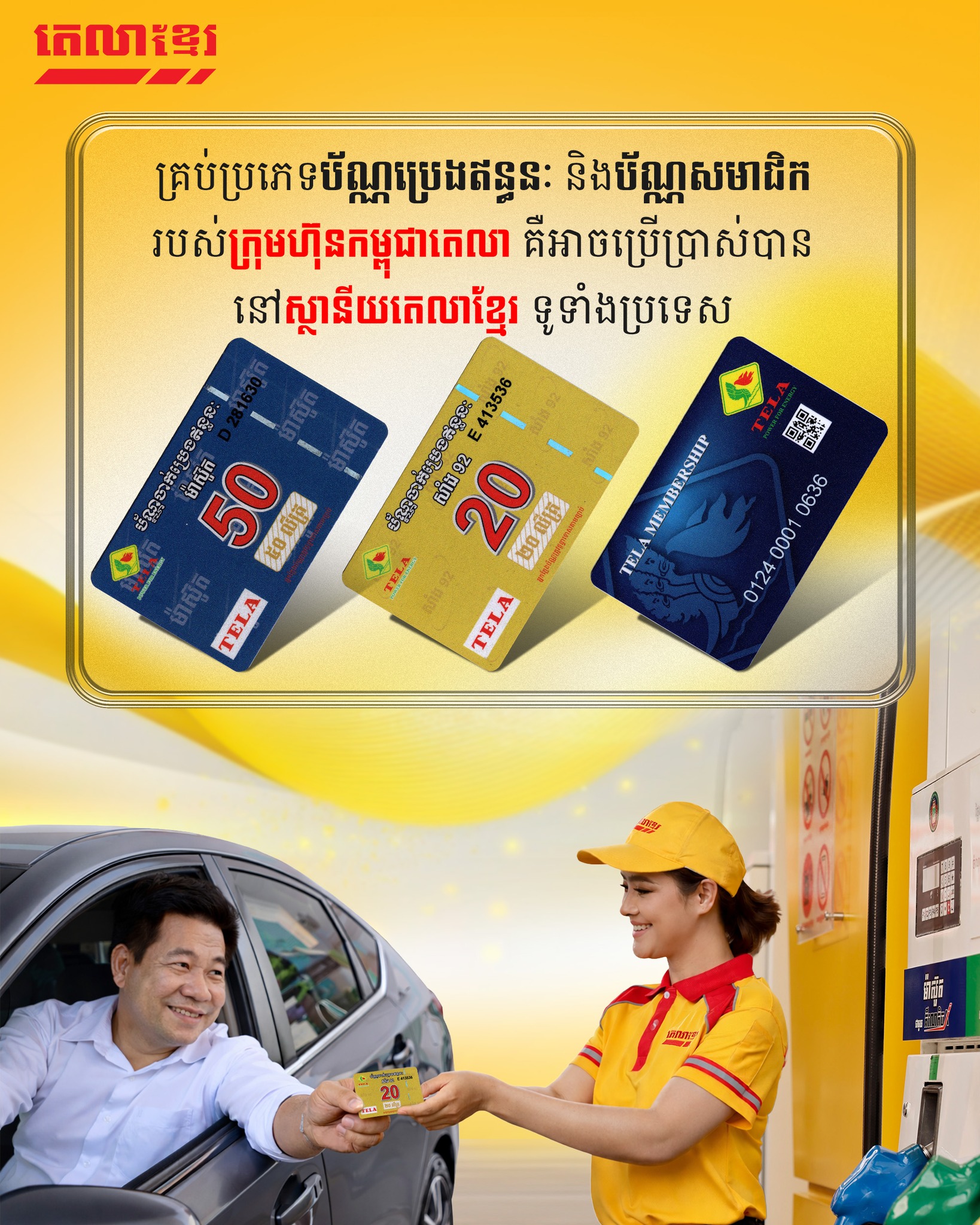 All types of fuel cards (Gasoline and Diesel) and all business partner membership cards of Cambodia Tela Company are accepted at every Tela Khmer fuel station nationwide.